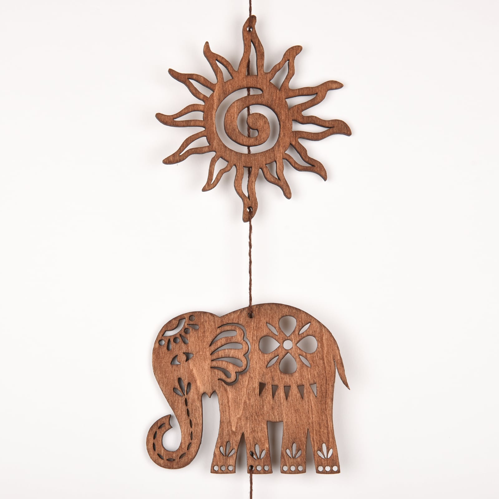 三頭のゾウ(象)の親子と導きの太陽の木製ガーランド。